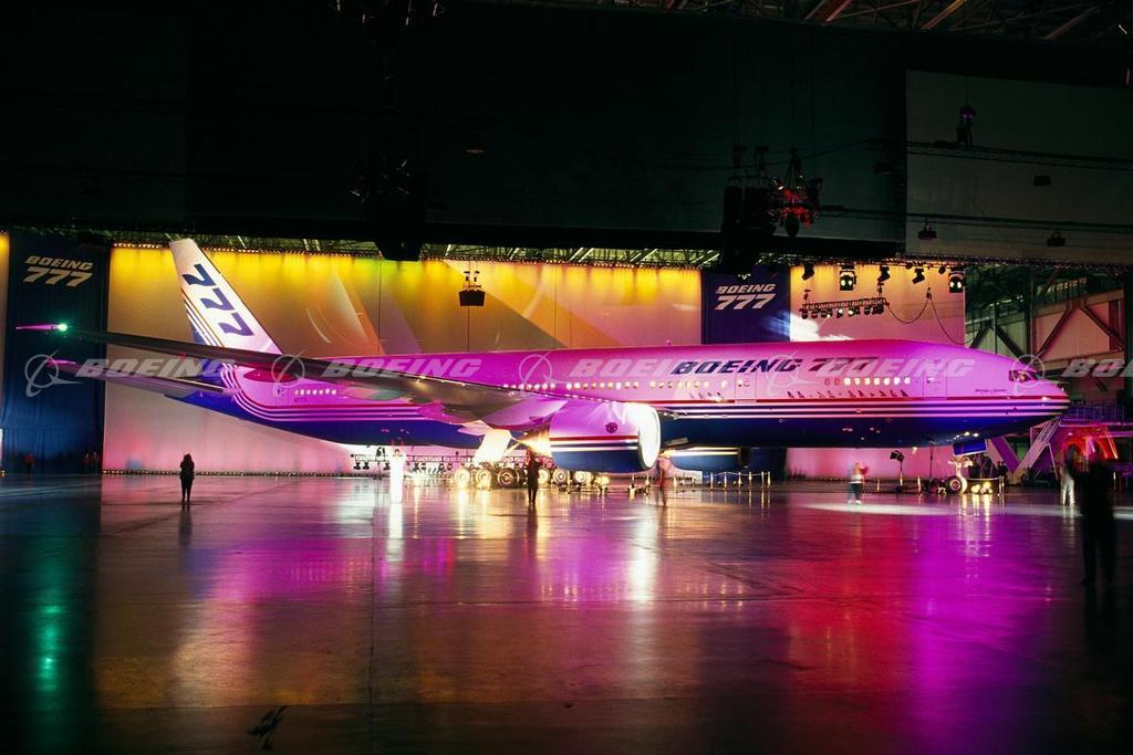Ceremonial rollout of the first 777. Boeing unveiled the first 777 to approximately 100,000 employees and their guests, customers and suppliers.