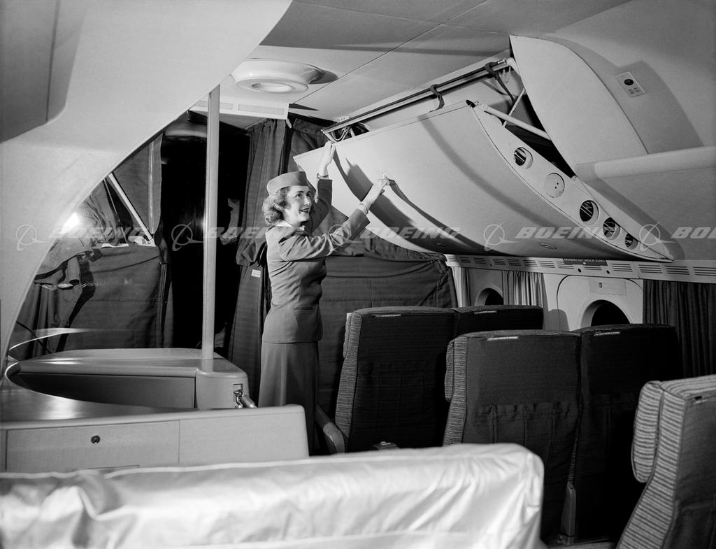 The 307 Stratocruiser set a new standard for luxurious air travel with its tastefully decorated extra-wide passenger cabin and gold-appointed dressing rooms. A circular staircase led to a lower-deck beverage lounge, and flight attendants prepared hot meals for 50 to 100 people in a state-of-the-art galley. As a sleeper, the Stratocruiser was equipped with 28 upper-and-lower bunk units. Boeing built 56 Stratocruisers between 1947 and 1950, and they marked the company's first significant success selling passenger planes to airlines in other countries.