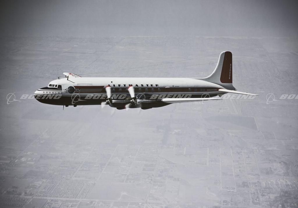Douglas DC-6 (1946-1958): Nearly identical to the DC-4 in appearance, the DC-6 was first conceived as a long-range military transport. The plane made its maiden flight on February 15, 1946. The key difference between the DC-4 and DC-6 was the DC-6’s larger engines, which were twice as powerful as the engines on the DC-4. The DC-6 was the first Douglas airliner with a pressurized cabin, which enabled it to fly higher and faster, thus taking its passengers “over the weather.” The DC-6 was the most economical commercial aircraft of the propeller era. Its operating costs were among the lowest until jetliners came on the scene. Military versions were produced under the designations C-118 (Air Force) and R6D (Navy). President Harry Truman chose a DC-6 for official use, and christened it the “Independence,” for his hometown in Missouri. During its 12-year production run, Douglas delivered 537 DC-6s, plus 167 military versions.