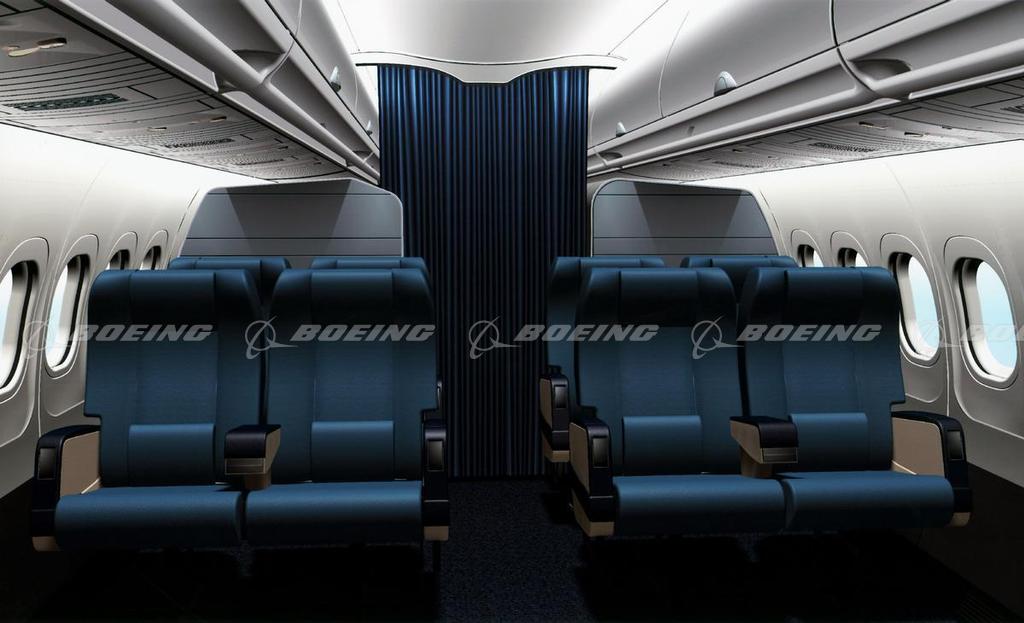 The standard 717 has a two-class configuration with 106 seats. Its passenger-pleasing interior features a five-across-seating arrangement in economy class, with illuminated handrails and large overhead stowbins.