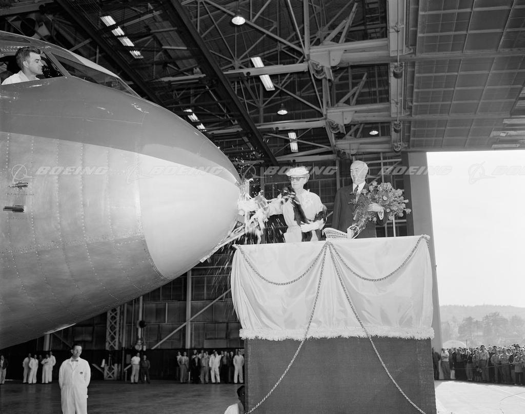 Mrs. William Boeing Christens the Boeing Dash 80 Prototype