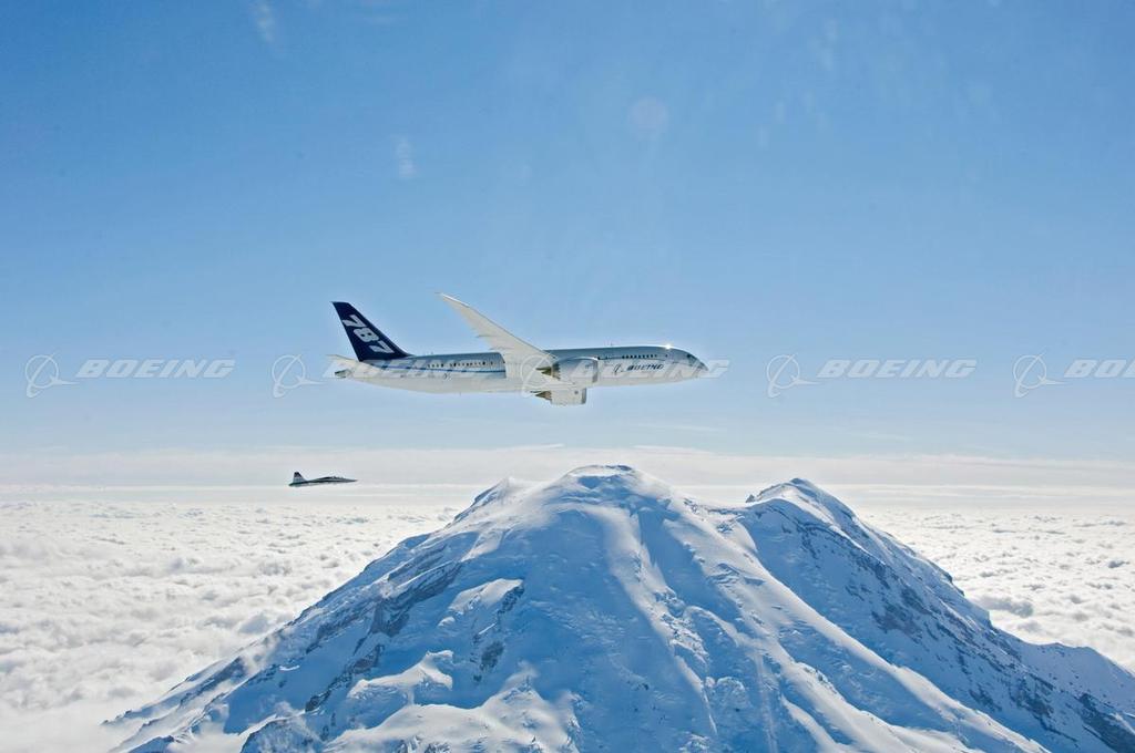 The First 787 Dreamliner in Flight above Mountains