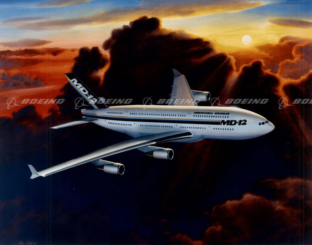 The McDonnell Douglas MD-12 was an all-new double-deck, four-engined ultra-large airliner design that could seat 430 to 511 passengers. The aircraft length was 208 feet (63 meters) and the wingspan was 213 feet (64.5 meters), with a fuselage 24 feet 3 inches (7.4 meters) high and nearly 28 feet (8.5 meters) wide. The design was unveiled in April 1992 with First Flight targeted for late 1995 and customer delivery in 1997. MDC was unable to find enough customer interest in the $5.5 billion project and it was cancelled without receiving any orders.