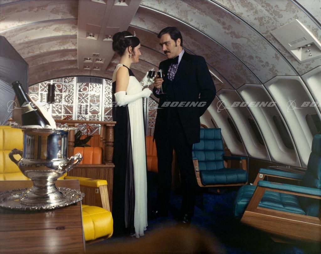 A couple in formal evening wear relax on the upper deck of the 747-200 mock-up.