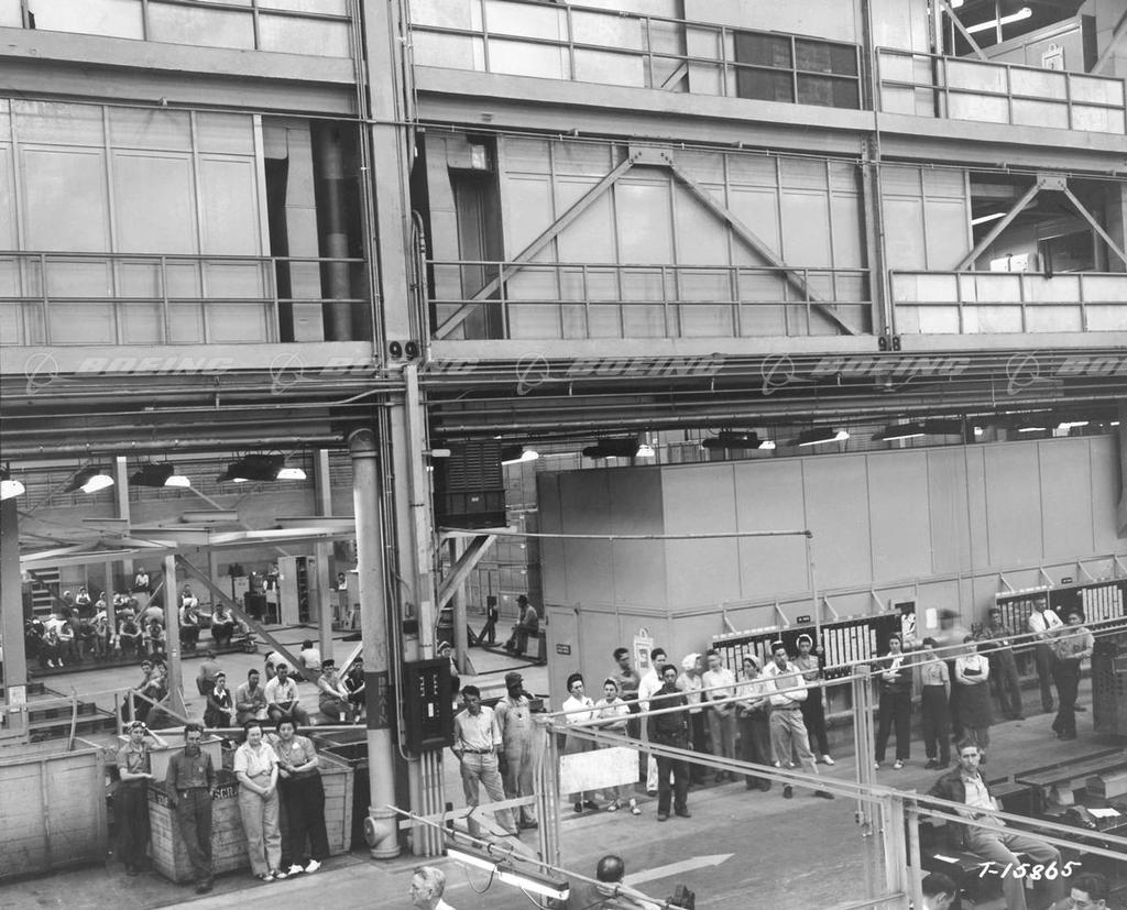 Douglas Tulsa workers are shown listening to a special announcement of the end of the war in Europe on May 8th, 1945.