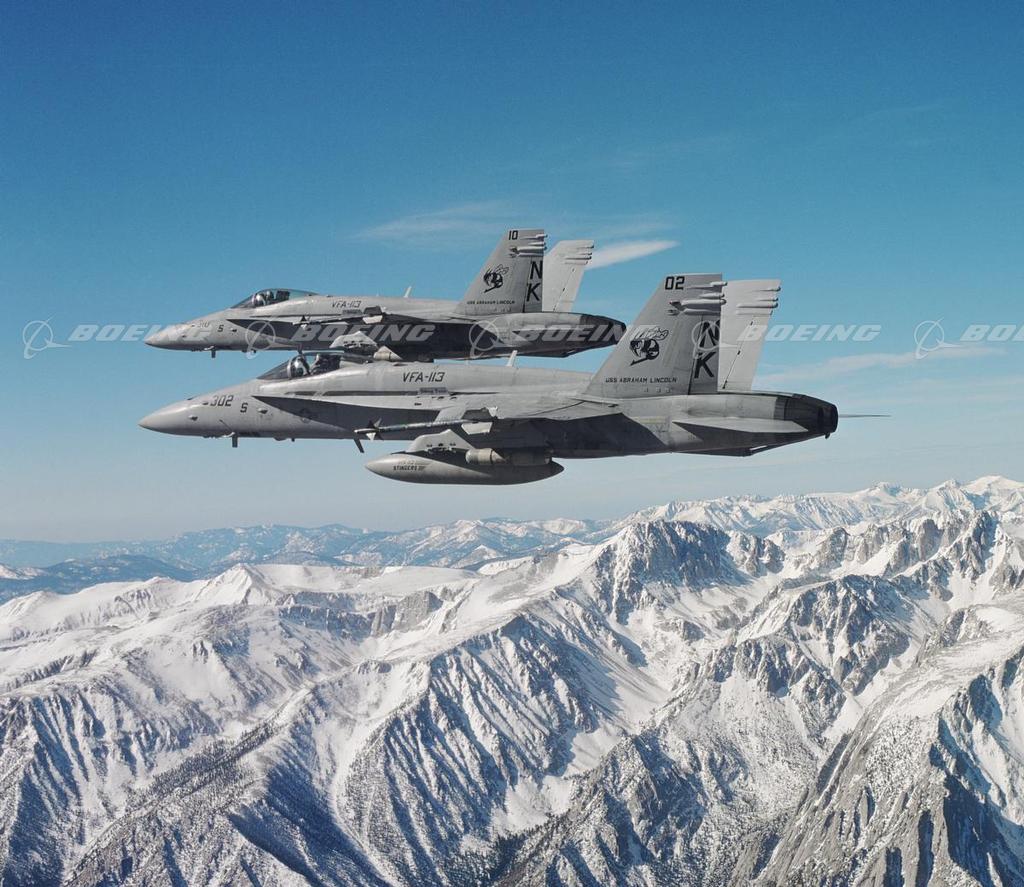 F/A-18E/F Super Hornets in Flight Above Sierra Nevada Mountains