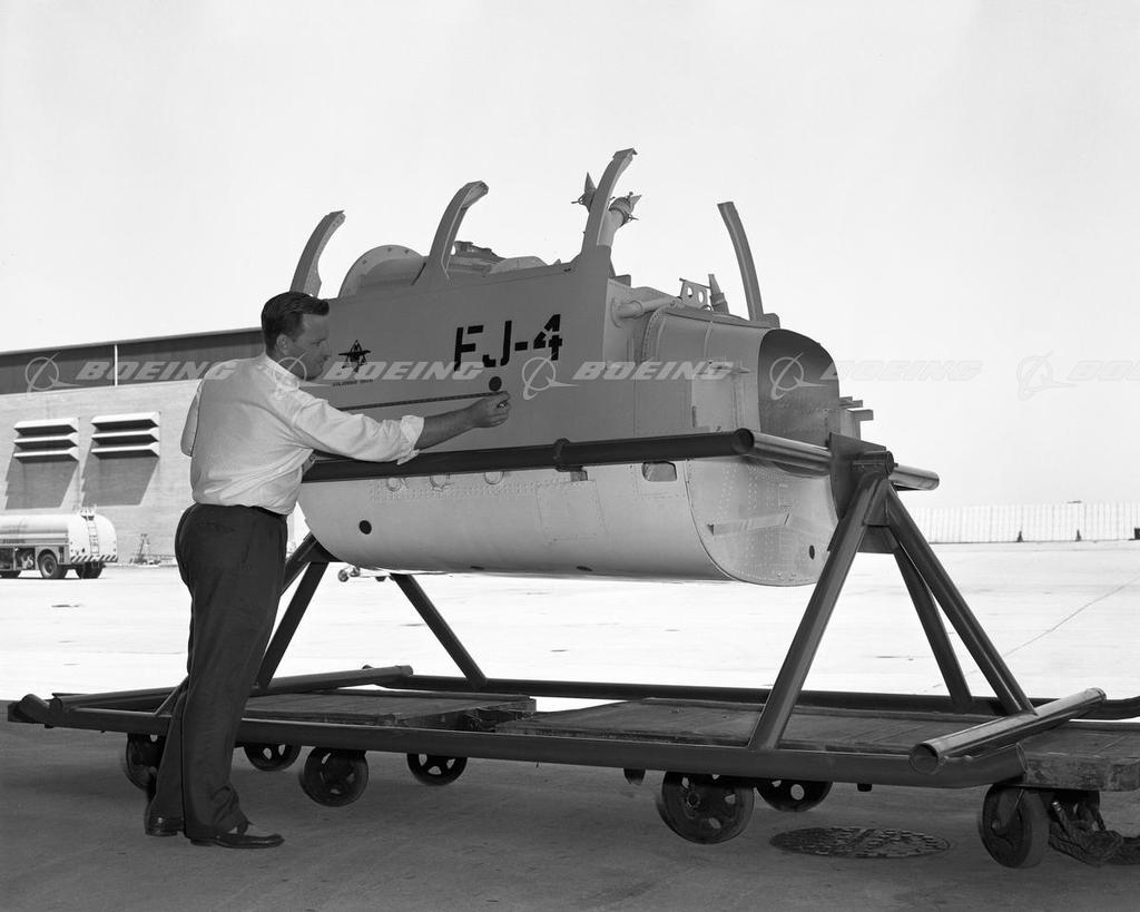 The North American Aviation FJ-1 Fury, the first of a series of four Navy aircraft, was a single-engine, single-seat, low-wing monoplane with short stubby wings looking much like a high-flying bomb. With the air intake, engine and fuel tanks enclosed within the airplane, the fighter was given super-thin high speed laminar flow wings. The FJ-1 was the first American jet fighter to employ a single, straight ram duct with its entrance in the nose. Later versions, the -2, -3 and -4 models, were designed with swept wings for operation at higher altitudes and faster speed over a greater range than earlier Fury jets.