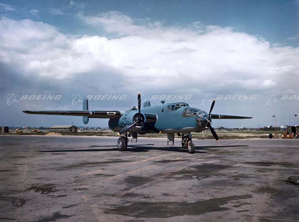 Named after General 'Billy' Mitchell, America's foremost supporter of air power, the B-25 Mitchell first flew on Aug. 19, 1940, and was the first multiengine design to go beyond the prototype stage. North American Aviation built more than 11,000 B-25s for the U.S. Army Air Forces and the U.S. Navy, which called it the PBJ, plus 50 each for China and Great Britain. The B-25 bomber had a wingspan of 67 feet and was 52 feet 11 inches long. One version, the B-25H, was the most heavily armed attack bomber of its time, with a 75-millimeter gun, up to 14 .50 caliber machine guns and 5,000 pounds of bombs carried in an internal bomb bay.