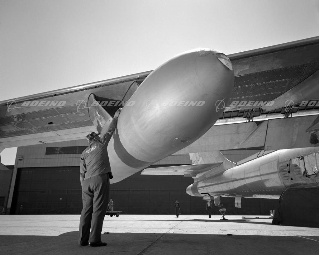 Boeing Worker Reaches Up Under B-47E Stratojet Wing