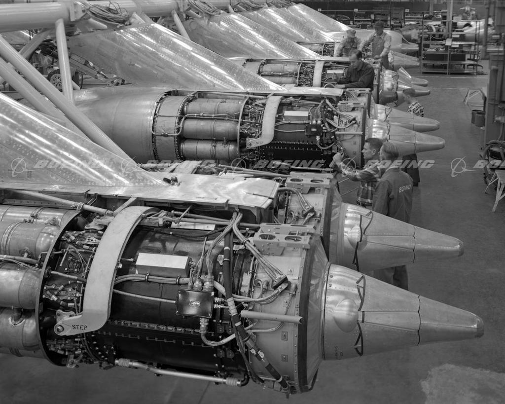 At the time of its first flight, Dec. 17, 1947, the B-47 Stratojet represented a radical departure from traditional design, and it set the design standards for all large jet aircraft until the present time. The six-engine Boeing B-47 was America's first multiengine swept-wing jet bomber. Its thin 116-foot wing was extraordinarily flexible and swept back at a 35-degree angle. Eighteen small rocket units in the fuselage provided jet-assisted takeoff (JATO), and parachutes cut its landing speeds. Later models were powered by 5,200-pound-thrust axial-flow jet engines, and top speeds were 600 mph. A total of 2,032 B-47s in all versions were built.