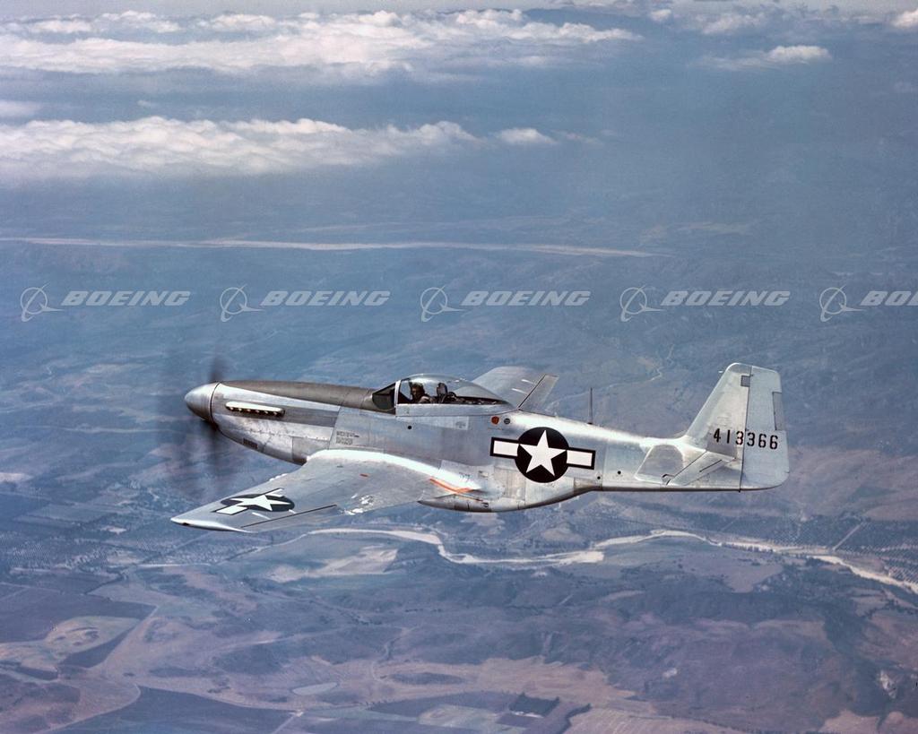North American Aviation's powerful and agile P-51 was the first single-engine aircraft based in England to penetrate Nazi Germany during World War II. With its superior aerodynamics, the Mustang outperformed enemy planes and went on to establish an impressive aerial record. Initially designed for the British Royal Air Force for fighter reconnaissance, it first flew in 1941. By war's end North American built 15,575 P-51 Mustangs. The P-51D Mustang had a wingspan of 37 feet and was 32 feet long. Powered by one 1,490- horsepower engine, it flew 437 mph with a range of 2,300 miles.