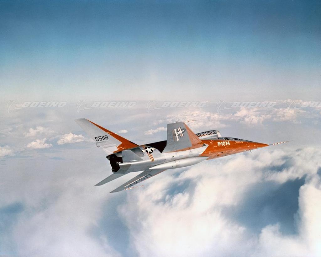 After the F-100 Super Sabre was in production, the design was reconfigured to meet Air Force requirements for a fighter-bomber capable of delivering a nuclear payload at Mach 2 speeds. The first versions were designated F-100B, but when the U.S. Air Force ordered prototypes, the designation changed to YF-107A (NA-212). The air intake was located behind the cockpit to permit installation of a fire control radar. The YF-107A was the last fighter North American Aviation built for the USAF, and it flew Mach 2 in its first all-out test flights during 1957. The three YF-107As provided valuable data for advanced flight research. They were followed by the F-108 (NA-257) Rapier, which entered the design stage as a Mach 3 interceptor, but was never produced.