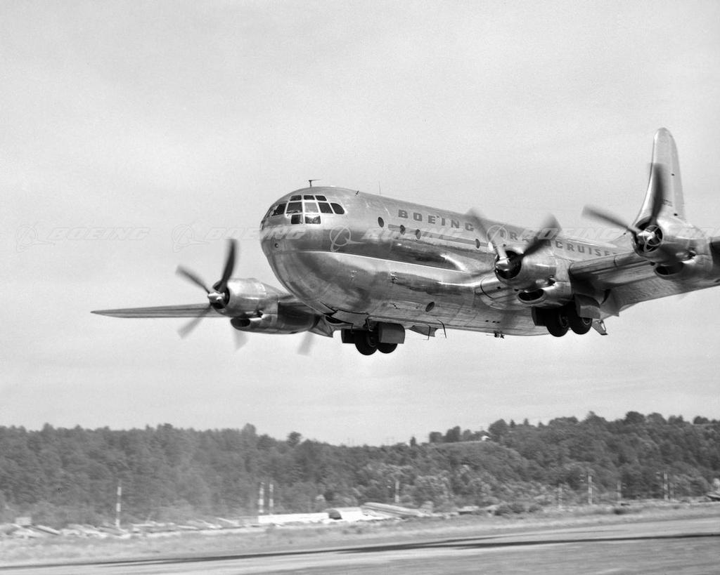 The 377 Stratocruiser was the last of the Boeing propeller-powered luxury airliners. Known as the First Lady of the Airways, it first flew in 1947 as the elegant, civilian offspring of the C-97, a military freighter that carried soldiers and equipment during World War II. A circular stairway led from the cabin to a lower deck luxury lounge. As a sleeper, it held 28 upper- and lower-bunk units. The first Stratocruiser began service in 1949 between San Francisco to Honolulu. Only five years later, the Boeing Dash 80 prototype for the Model 707 made its first flight, and the Stratocruiser became obsolete. It found a new career as special transport for large sections of spacecraft. With its fuselage swollen by a superstructure, the once-elegant Stratocruiser became known as the Pregnant Guppy and, even larger, as the Super Guppy.