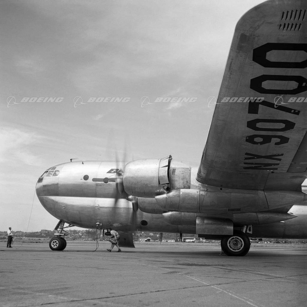 The 377 Stratocruiser was the last of the Boeing propeller-powered luxury airliners. Known as the First Lady of the Airways, it first flew in 1947 as the elegant, civilian offspring of the C-97, a military freighter that carried soldiers and equipment during World War II. A circular stairway led from the cabin to a lower deck luxury lounge. As a sleeper, it held 28 upper- and lower-bunk units. The first Stratocruiser began service in 1949 between San Francisco to Honolulu. Only five years later, the Boeing Dash 80 prototype for the Model 707 made its first flight, and the Stratocruiser became obsolete. It found a new career as special transport for large sections of spacecraft. With its fuselage swollen by a superstructure, the once-elegant Stratocruiser became known as the Pregnant Guppy and, even larger, as the Super Guppy.