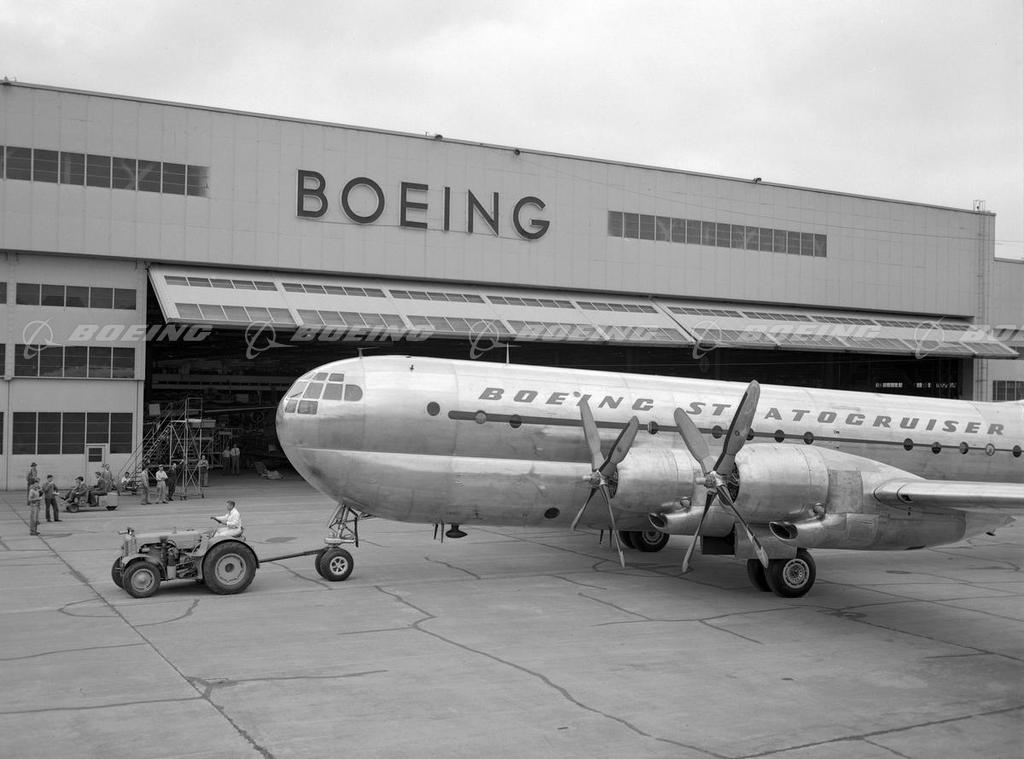 The 377 Stratocruiser was the last of the Boeing propeller-powered luxury airliners. Known as the First Lady of the Airways, it first flew in 1947 as the elegant, civilian offspring of the C-97, a military freighter that carried soldiers and equipment during World War II. A circular stairway led from the cabin to a lower deck luxury lounge. As a sleeper, it held 28 upper- and lower-bunk units. The first Stratocruiser began service in 1949 between San Francisco to Honolulu. Only five years later, the Boeing Dash 80 prototype for the Model 707 made its first flight, and the Stratocruiser became obsolete. It found a new career as special transport for large sections of spacecraft. With its fuselage swollen by a superstructure, the once-elegant Stratocruiser became known as the Pregnant Guppy and, even larger, as the Super Guppy.