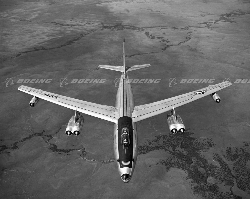 A Boeing RB-47E Stratojet, world's fastest day-or-night long-range photo ship, is shown high above Kansas on a recent test flight out of the Wichita Division of Boeing Airpane Company. The RB-47E, sister ship to the standard B-47 medium bomber, is a specialized plane designed particularly for high and low altitude photo reconnaissance. Like the bomber version of the Stratojet, the RB-47E is capable of speeds in excess of 600 miles-an-hour and has a service ceiling of more than 40,000 feet. Both models are now in quantity production for the U.S. Air Force at the Boeing-Wichita plants.