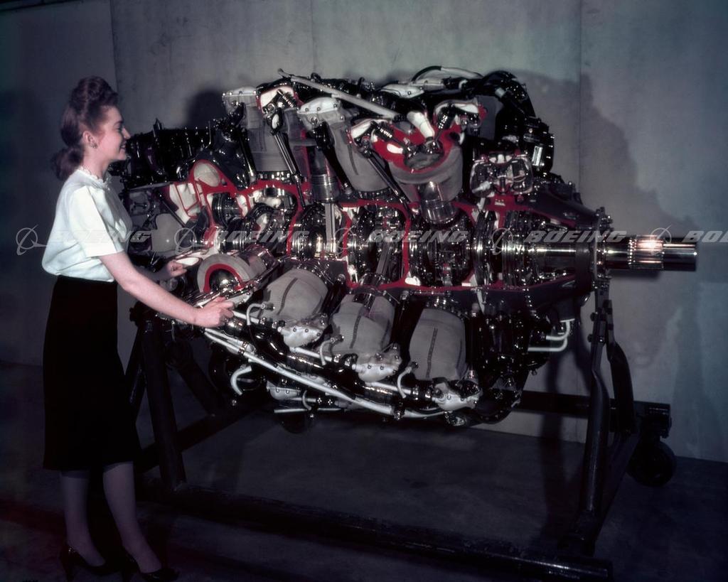 Woman with a cutaway Pratt and Whitney R-4360 aircraft engine. This engine was used on the XF8B, the B-50, C-97 series and the 377 Stratocruiser.