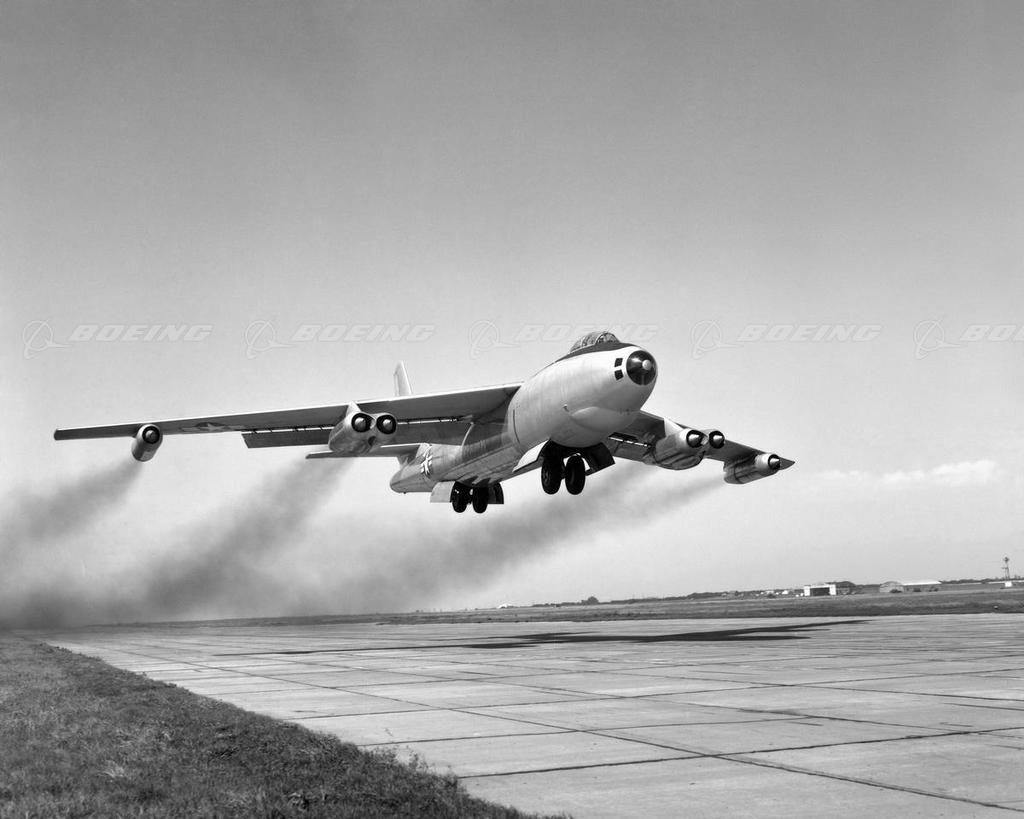 At the time of its first flight, Dec. 17, 1947, the B-47 Stratojet represented a radical departure from traditional design, and it set the design standards for all large jet aircraft until the present time. The six-engine Boeing B-47 was America's first multiengine swept-wing jet bomber. Its thin 116-foot wing was extraordinarily flexible and swept back at a 35-degree angle. Eighteen small rocket units in the fuselage provided jet-assisted takeoff (JATO), and parachutes cut its landing speeds. Later models were powered by 5,200-pound-thrust axial-flow jet engines, and top speeds were 600 mph. A total of 2,032 B-47s in all versions were built.