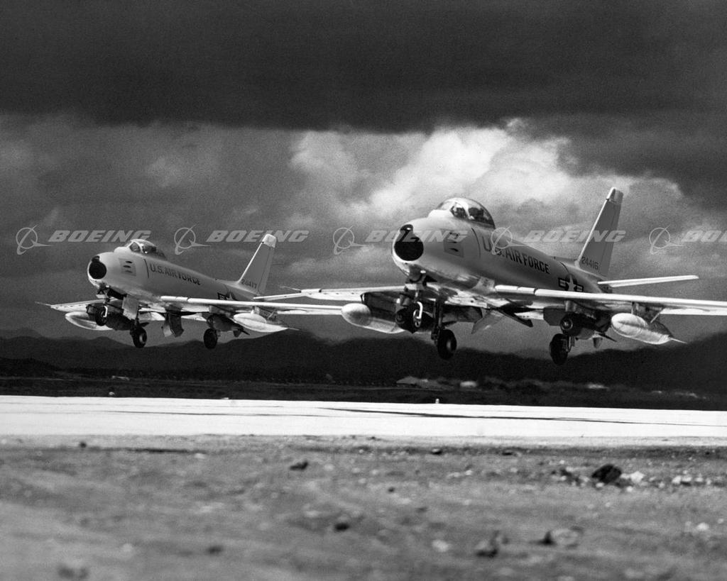 The North American F-86 Sabre Jet made its first flight Oct. 1, 1947, and was America’s first single-seat, swept-wing jet fighter. In 1948, it set a new world speed record of 671 mph, and it was the world’s first-line fighter for more than a decade after it was designed. More than 6,000 Sabre Jets were built worldwide. During the Korean conflict, the Sabre Jet flew 82,177 sorties during 32 months of combat and troop support. The version built for the U.S. Navy and Marine Corps was called the FJ-2 Fury.