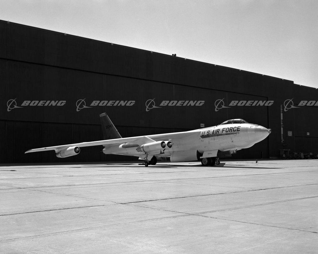 At the time of its first flight, Dec. 17, 1947, the B-47 Stratojet represented a radical departure from traditional design, and it set the design standards for all large jet aircraft until the present time. The six-engine Boeing B-47 was America's first multiengine swept-wing jet bomber. Its thin 116-foot wing was extraordinarily flexible and swept back at a 35-degree angle. Eighteen small rocket units in the fuselage provided jet-assisted takeoff (JATO), and parachutes cut its landing speeds. Later models were powered by 5,200-pound-thrust axial-flow jet engines, and top speeds were 600 mph. A total of 2,032 B-47s in all versions were built.