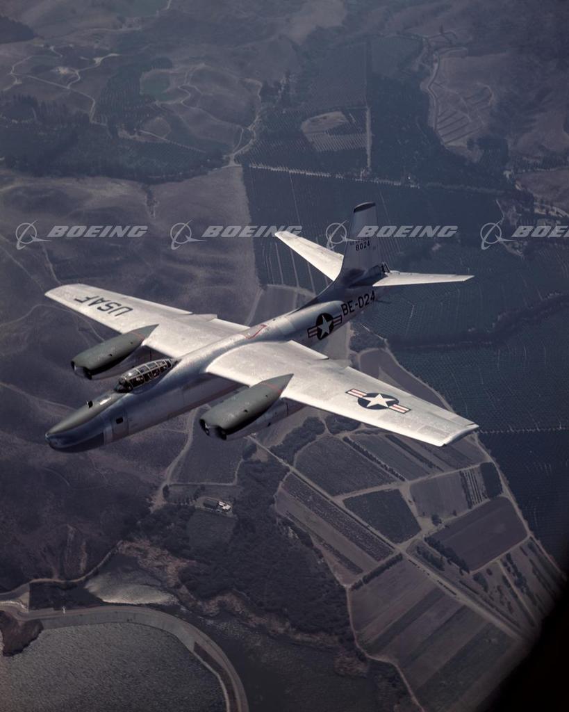 North American Aviation's straight-wing B-45 Tornado, designed during 1944 and 1945, first flew in February 1947. It was the first jet bomber in service with the Air Force and the first four-jet airplane to fly in the United States. Versions included the longer-range B-45C with wingtip tanks and the photoreconnaissance version, the RB-45C. Rated as a light bomber by modern-day standards, it was the first four-jet aircraft to drop an atom bomb and the first to be refueled in midair. It had a wingspan of 89 feet, and it was 75 feet 11 inches long.