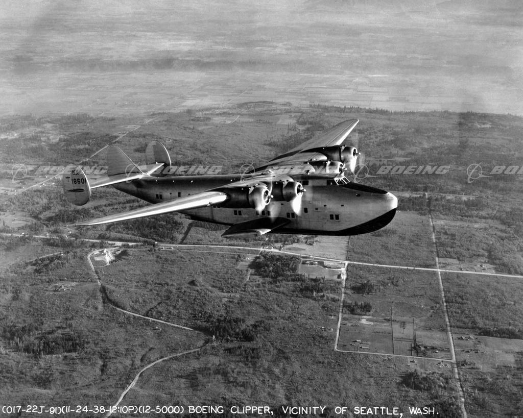 The whale-shaped Boeing Model 314 flying boat took cruise ship elegance into the air. Luxurious amenities aboard the Clipper included a stylish lounge, a dining salon, and a bridal suite. At 106 feet long with a 152-foot wingspan, it was the largest passenger transport in its time. At night, 74 seats converted into 40 bunks. It first flew in 1938 and on June 28, 1939, made the first scheduled transatlantic flight. In 1943, President Franklin Delano Roosevelt celebrated his birthday on a Model 314 airplane, flying to Casablanca and back, becoming the first U.S. president to fly while in office