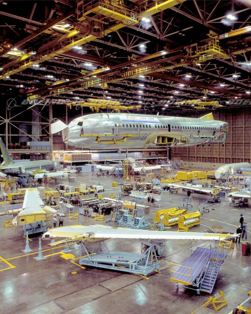 An overhead crane system guides the fuselage of the first 737-300 on its way to being joined with its wings at Boeing's Renton Assembly facility in 1983.
