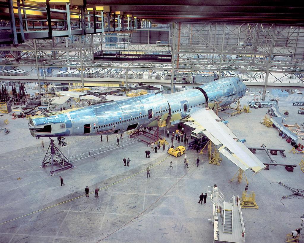 Production of the first 747s began as final phases of the Everett factory building project were completed.