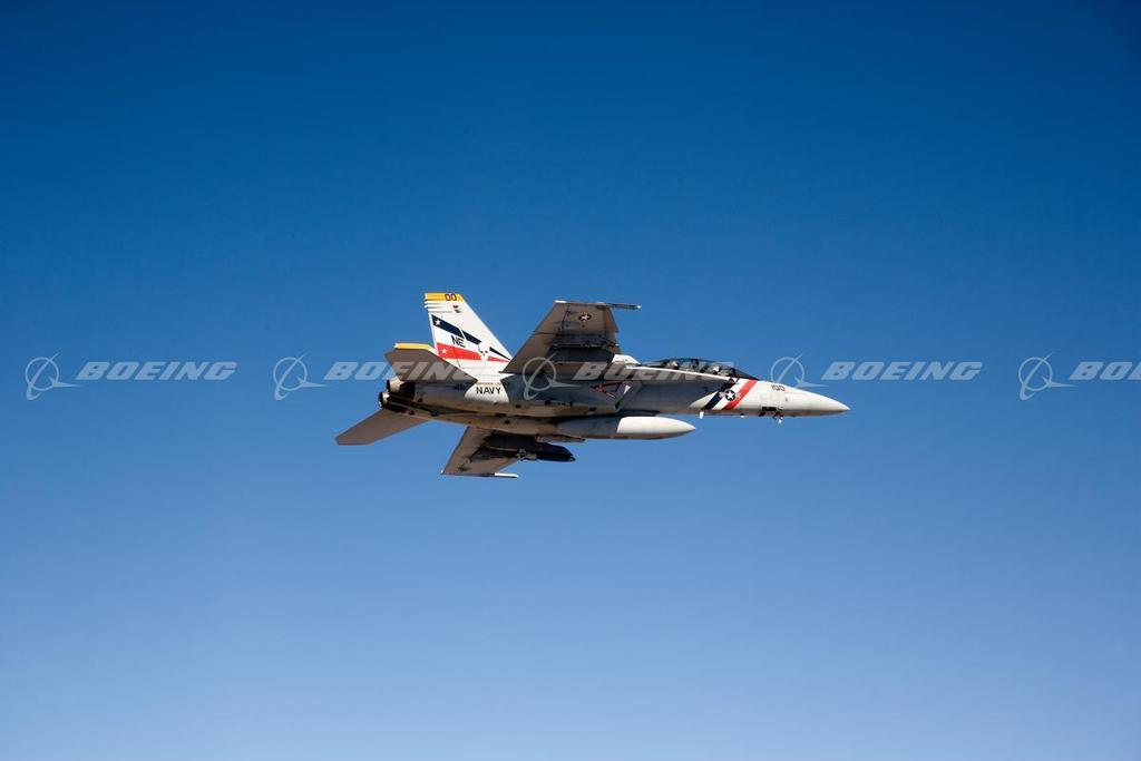 F/A-18E/F Super Hornet in Flight Against Blue Sky