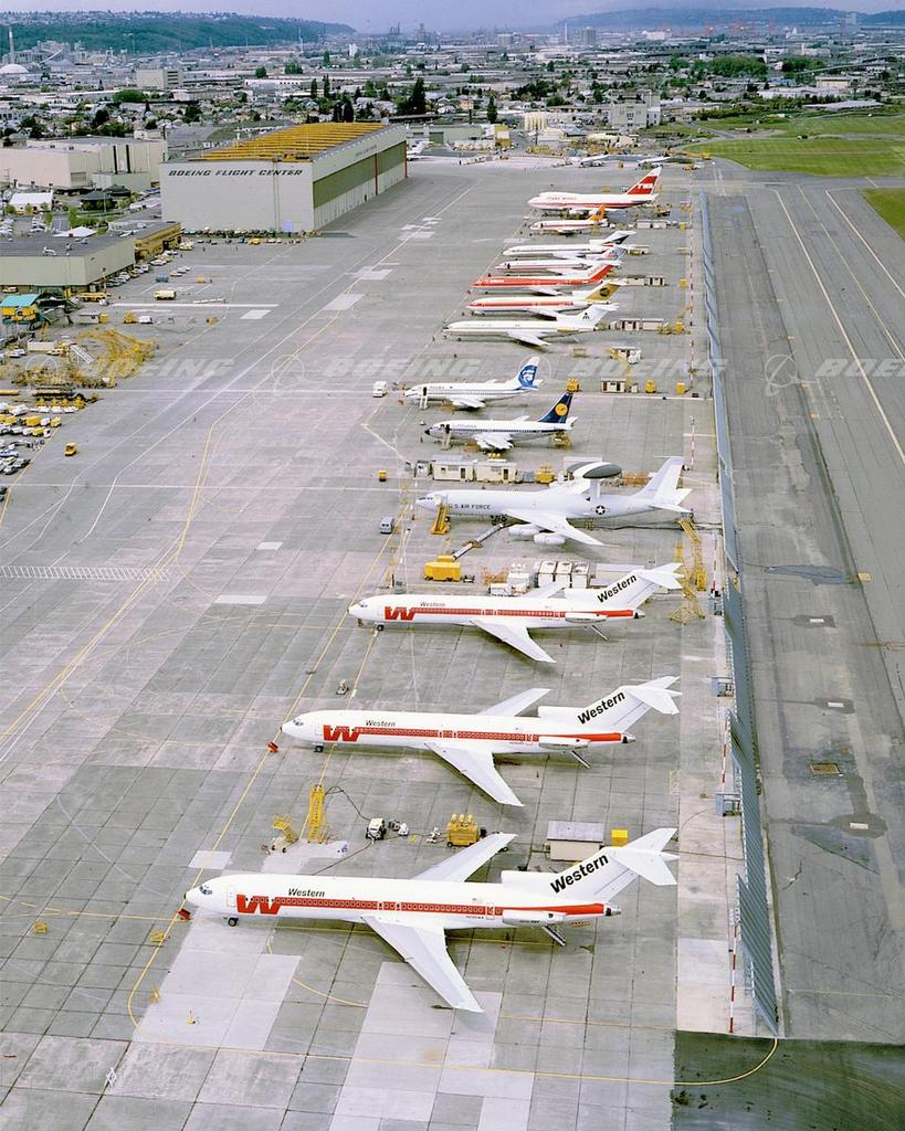 The jets on the Boeing Field flight line in this 1981 photo represent Boeing's 7 series airplanes of the time. The airplanes on display include a E-3 AWACS built on the 707 platform, 727, 737 and 747 airplanes.