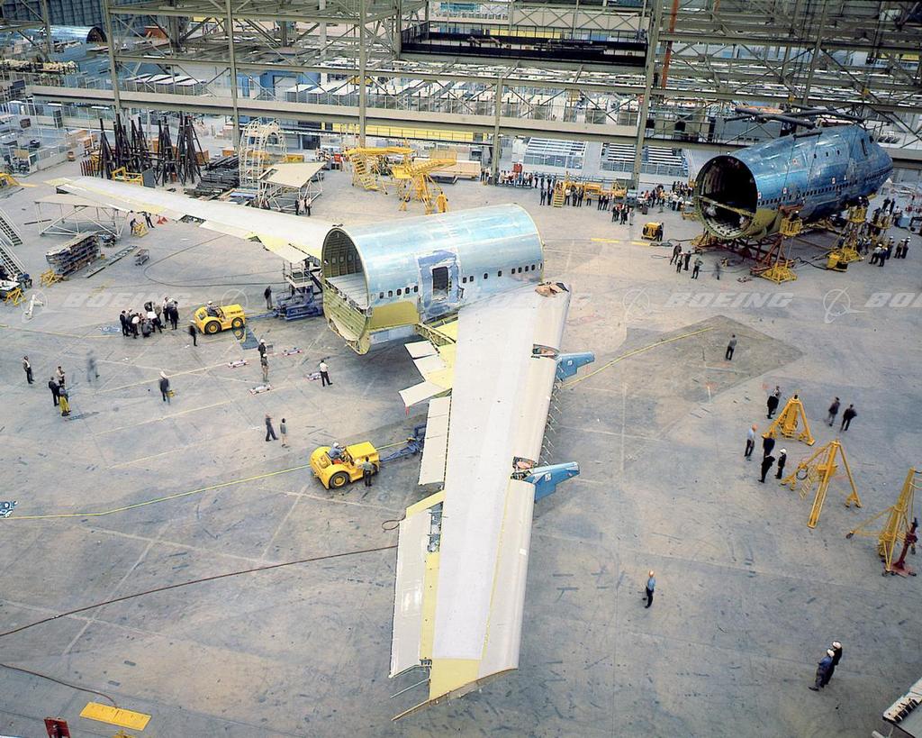Production of the first 747s began as final phases of the Everett factory building project were completed.