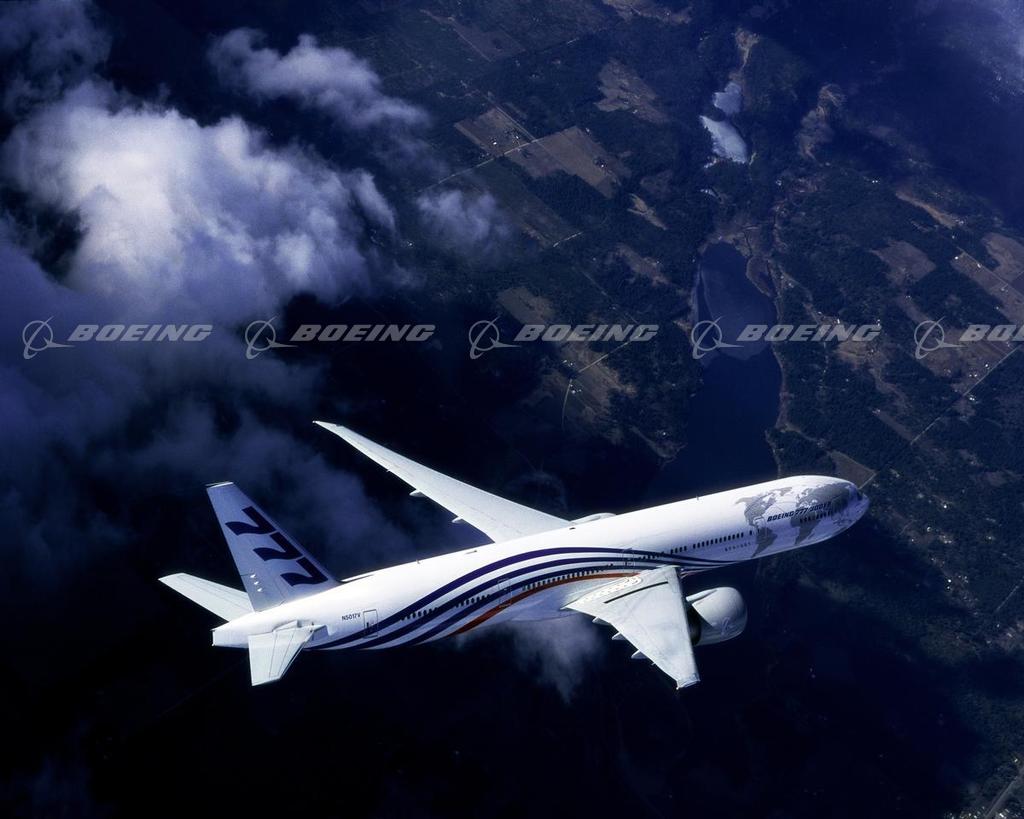 The wide-body Model 777 was the first commercial jet that was 100 percent digitally designed using three-dimensional solids technology. It earned the Collier Trophy for top aeronautical achievement in 1996. The twinjet commercial transport uses fuel efficiently, and its comfortable cabin is very popular with passengers. The 777-200 can take 305 passengers 5,995 miles. The 777-300 can carry 368 passengers 6,899 miles. Launched in February 2000, the 777-200LR and 777-300ER will fly 9,420 or 7,880 nautical miles, respectively.