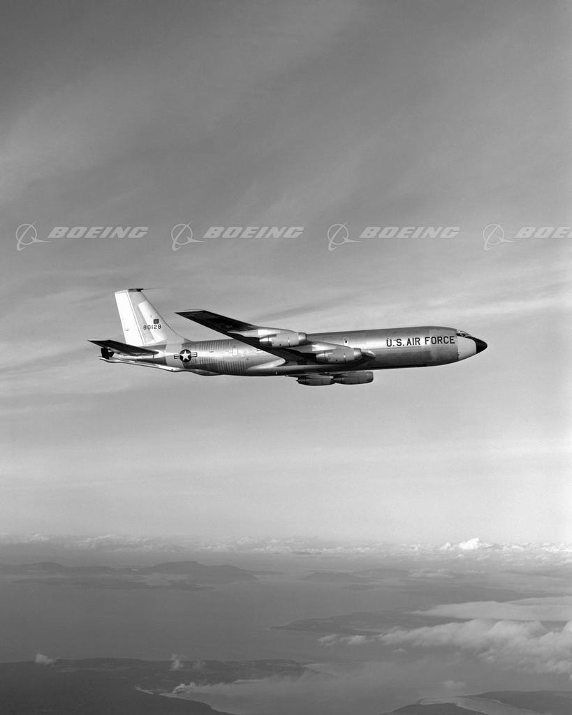 The KC-135 was the only jet airplane designed specifically for aerial refueling. More than 732 KC-135s were built, and most, with modifications, remain in service into the 21st century. The KC-135 shared the Dash-80 prototype with the Boeing 707 commercial transport, but was launched first in 1956. The KC-135's aerial refueling equipment in the lower deck leave the upper deck clear for 25 tons of cargo or 80 troops. KC-135s supplied warplanes with fuel during the Persian Gulf conflict, Operation Enduring Freedom over Afghanistan, and for homeland defense.