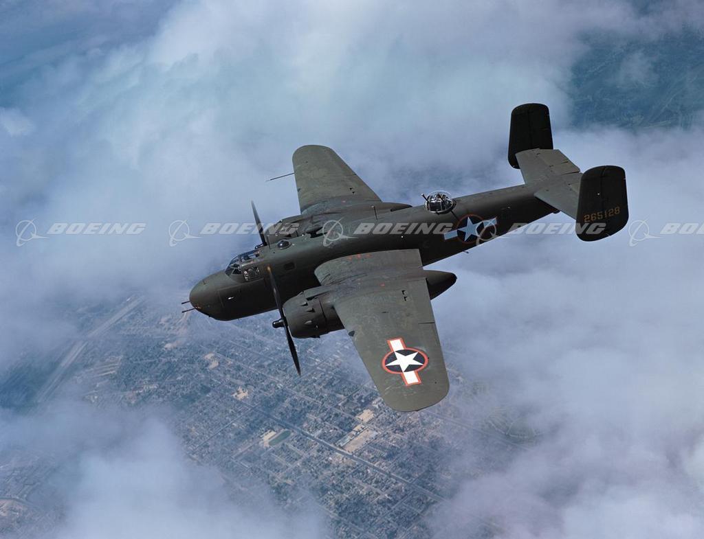 Named after General “Billy” Mitchell, America’s foremost supporter of air power, the B-25 Mitchell first flew on Aug. 19, 1940, and was the first multiengine design to go beyond the prototype stage. North American Aviation built more than 11,000 B-25s for the U.S. Army Air Forces and the U.S. Navy, which called it the PBJ, plus 50 each for China and Great Britain. The B-25 bomber had a wingspan of 67 feet and was 52 feet 11 inches long. One version, the B-25H, was the most heavily armed attack bomber of its time, with a 75-millimeter gun, up to 14 .50 caliber machine guns and 5,000 pounds of bombs carried in an internal bomb bay.