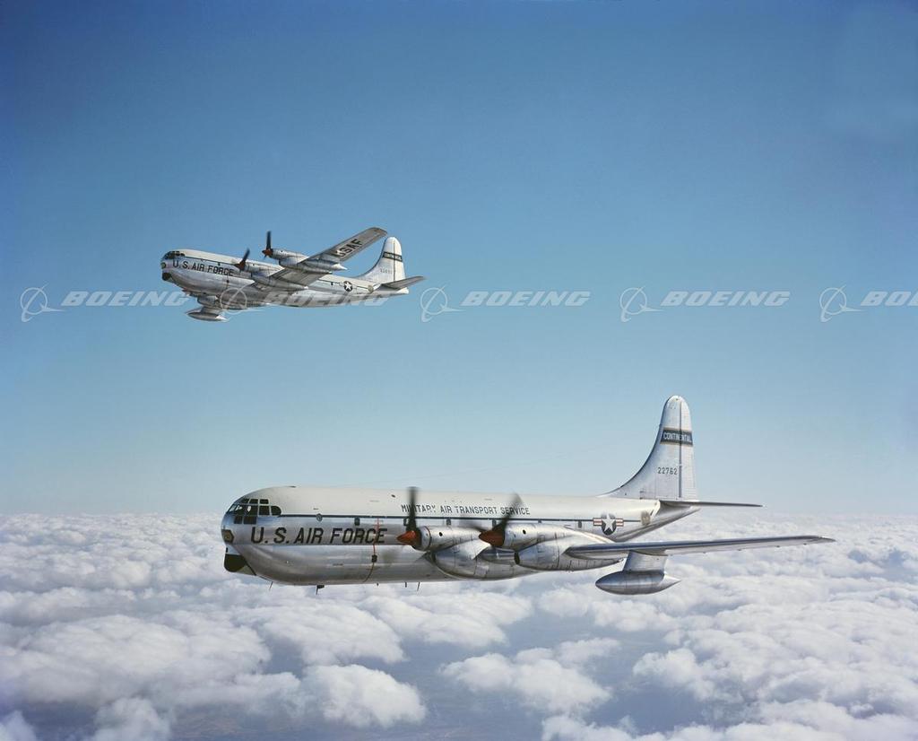 The C-97 Stratofreighter (Model 367) was the high-flying cargo and transport plane that evolved from the B-29 bomber. The pressurized Model 367s had a double-lobe fuselage consisting of two intersecting circular sections so its 74-foot-long upper deck had the larger diameter. Cargo was loaded through large clamshell doors in the belly using a built-in ramp and a hoist. In addition to five crew members, the C-97 Stratofreighter could carry 134 troops or 83 stretcher patients with four attendants.