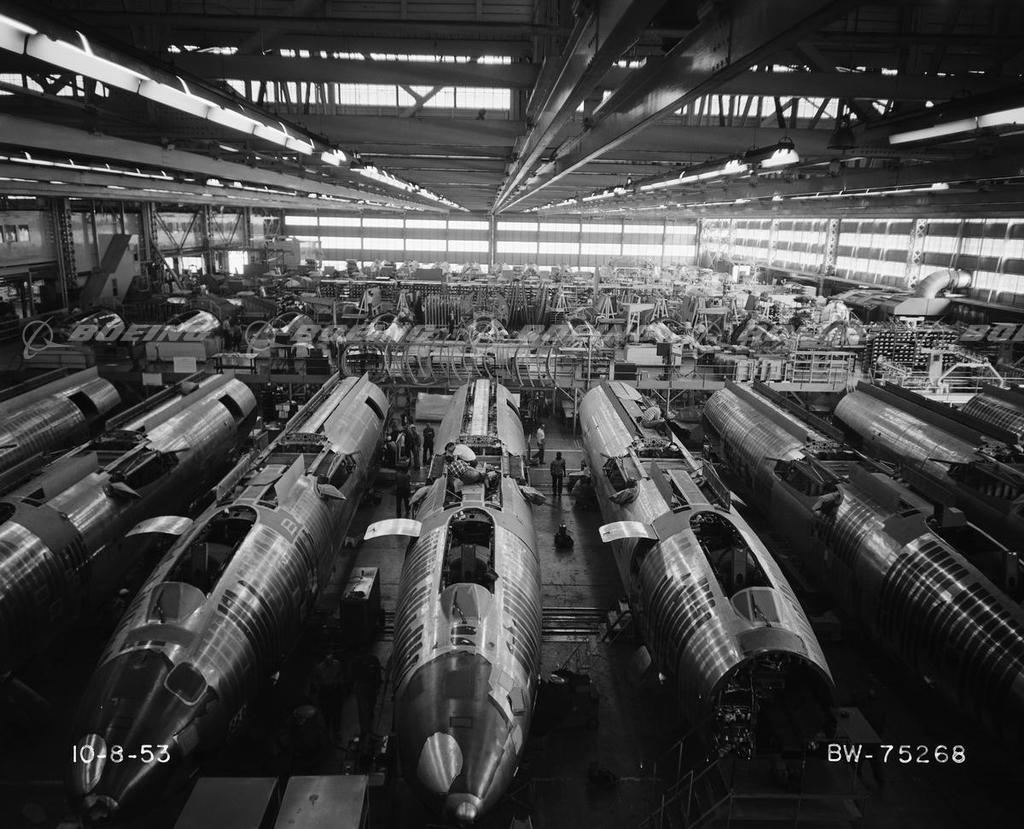 At the time of its first flight, Dec. 17, 1947, the B-47 Stratojet represented a radical departure from traditional design, and it set the design standards for all large jet aircraft until the present time. The six-engine Boeing B-47 was America's first multiengine swept-wing jet bomber. Its thin 116-foot wing was extraordinarily flexible and swept back at a 35-degree angle. Eighteen small rocket units in the fuselage provided jet-assisted takeoff (JATO), and parachutes cut its landing speeds. Later models were powered by 5,200-pound-thrust axial-flow jet engines, and top speeds were 600 mph. A total of 2,032 B-47s in all versions were built.