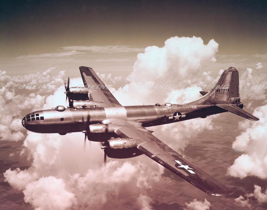 The Boeing B-29, the most technologically advanced airplane produced during World War II, first flew Sept. 21, 1942. At 105,000 pounds, it was the world’s heaviest production airplane. It was the first bomber with crew-cabin pressurization and remotely controlled power turrets. A total of 3,970 B-29s were built, with improvements added to the bombers as they went through the production line as data came in from pilots in action. World War II ended when two B-29s, the Enola Gay and Bockscar dropped atomic bombs on Hiroshima and Nagasaki.