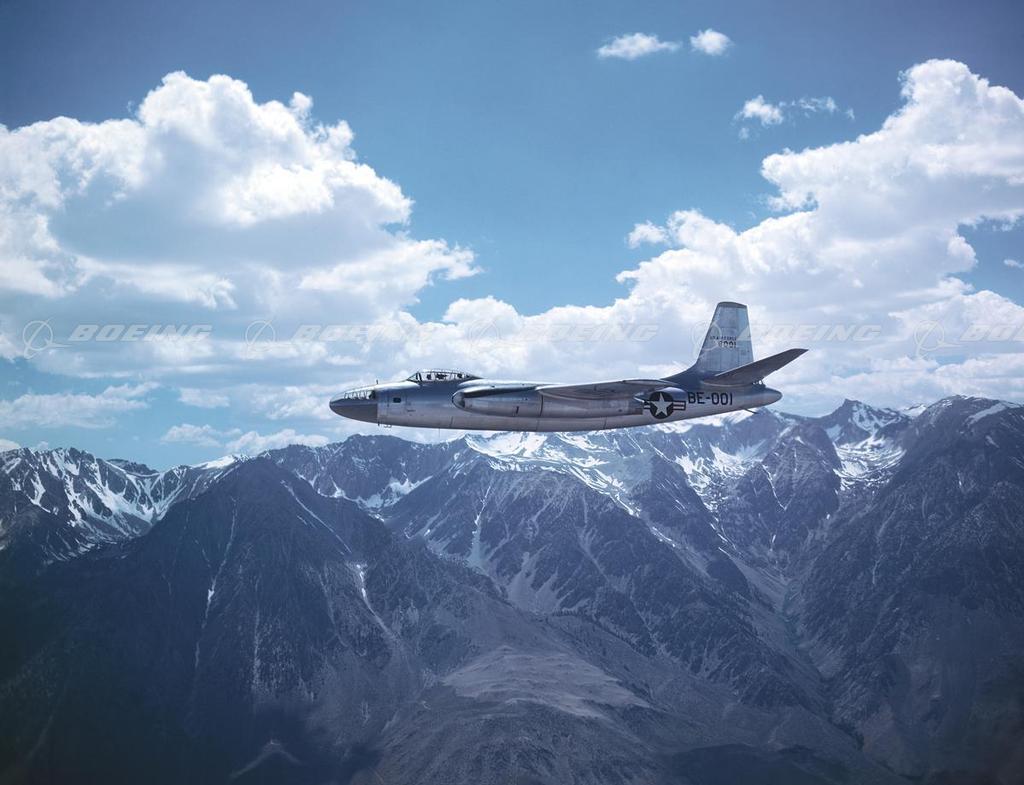 North American Aviation’s straight-wing B-45 Tornado, designed during 1944 and 1945, first flew in February 1947. It was the first jet bomber in service with the Air Force and the first four-jet airplane to fly in the United States. Versions included the longer-range B-45C with wingtip tanks and the photoreconnaissance version, the RB-45C. Rated as a light bomber by modern-day standards, it was the first four-jet aircraft to drop an atom bomb and the first to be refueled in midair. It had a wingspan of 89 feet, and it was 75 feet 11 inches long.