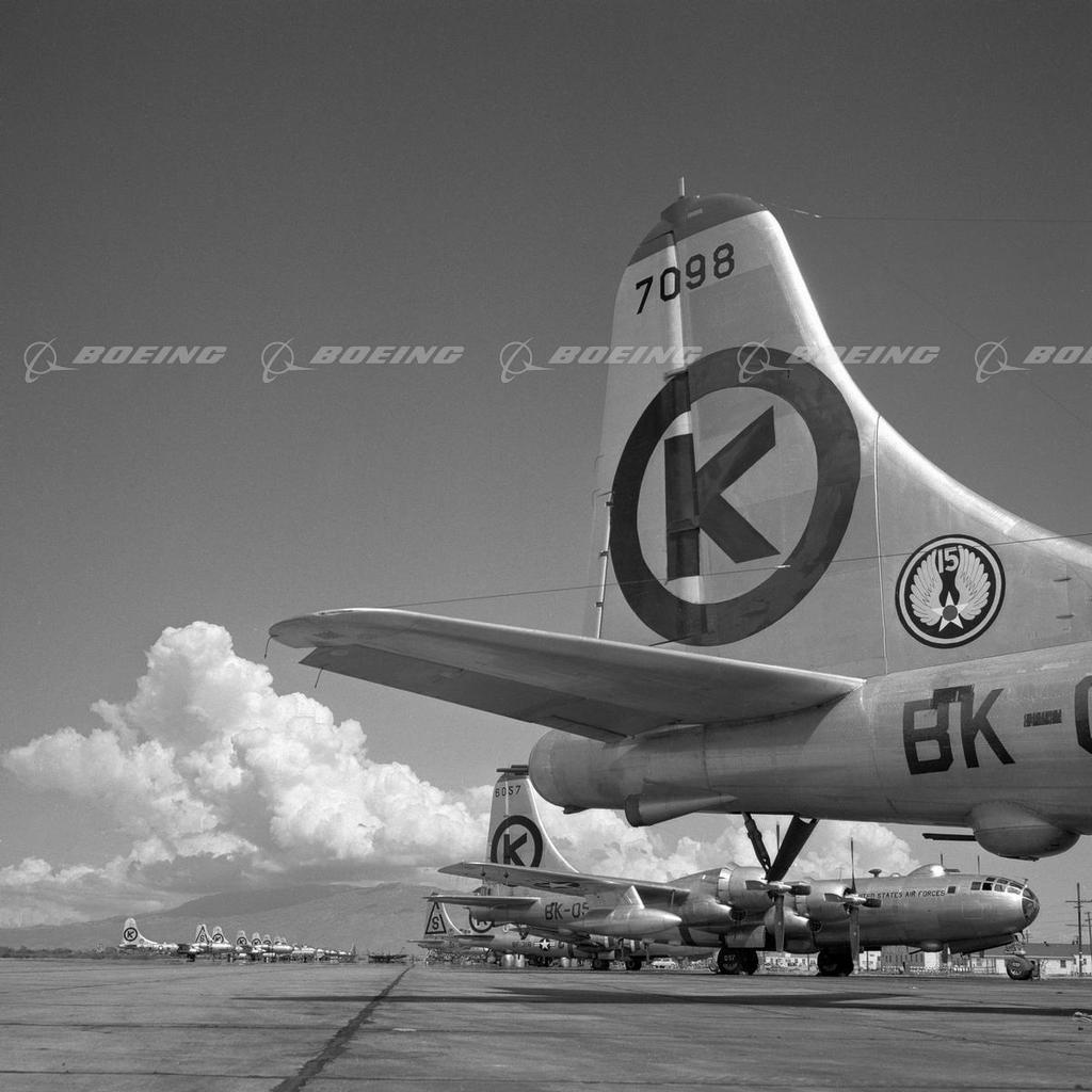 The four-engine, propeller-powered B-50 bomber, which first flew in 1947, was among the last piston-powered bombers built during an era that was to be dominated by jets. However, in 1949, the B-50A, the Lucky Lady II, made the first nonstop flight around the world in 94 hours, refueled in flight four times by KB-29Ms. The B-50 originally evolved from the B-29D but because it included so many improvements, it was redesignated the B-50A, with 59 percent more power than the B-29. The next version, the B-50B, fitted with cameras and wing tanks, was designated RB-50B and used for strategic reconnaissance. The B-50D, the most common variant, was distinguished by a one-piece transparent-plastic nose molding and an optically flat bombardier’s window in the lower portion. Some B50s were later converted to hose-type KB-50 aerial tankers, their speed enhanced by the addition of two 5,200-pound-thrust jet engines, so at 400 mph, they could refuel jet aircraft. One KB-50D became a drone to test Bell XGAM missiles and 36 became long-range reconnaissance aircraft (WB-50D).