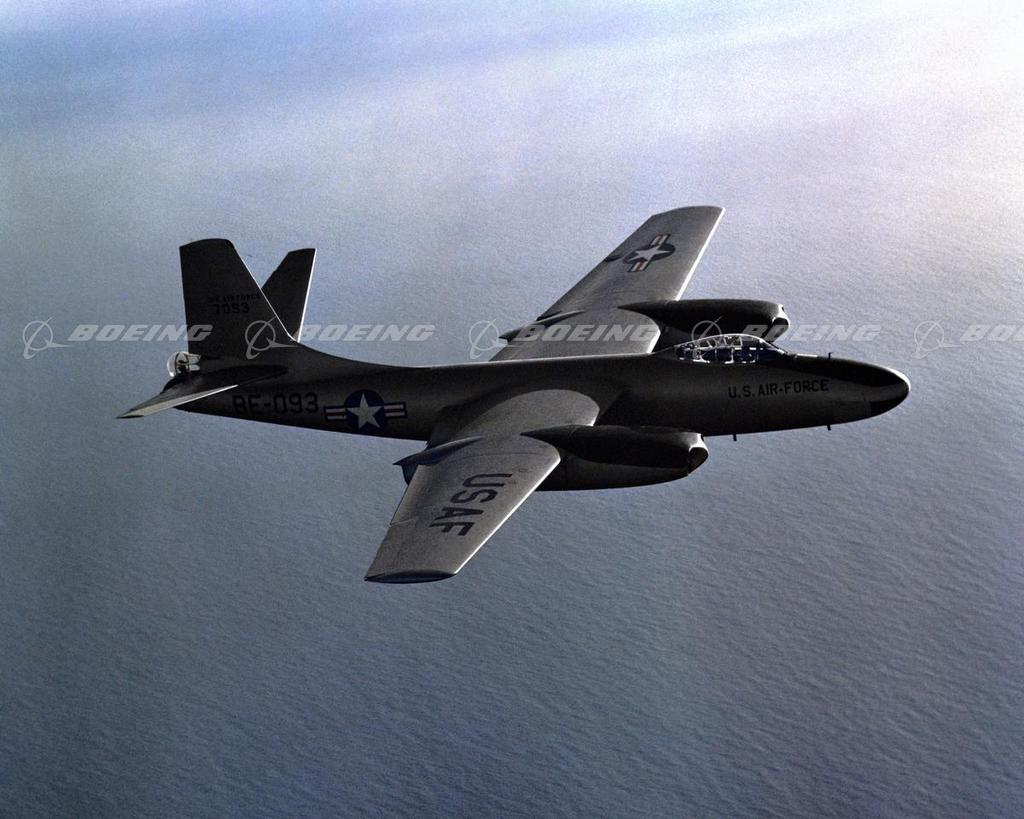 North American Aviation's straight-wing B-45 Tornado, designed during 1944 and 1945, first flew in February 1947. It was the first jet bomber in service with the Air Force and the first four-jet airplane to fly in the United States. Versions included the longer-range B-45C with wingtip tanks and the photoreconnaissance version, the RB-45C. Rated as a light bomber by modern-day standards, it was the first four-jet aircraft to drop an atom bomb and the first to be refueled in midair. It had a wingspan of 89 feet, and it was 75 feet 11 inches long.