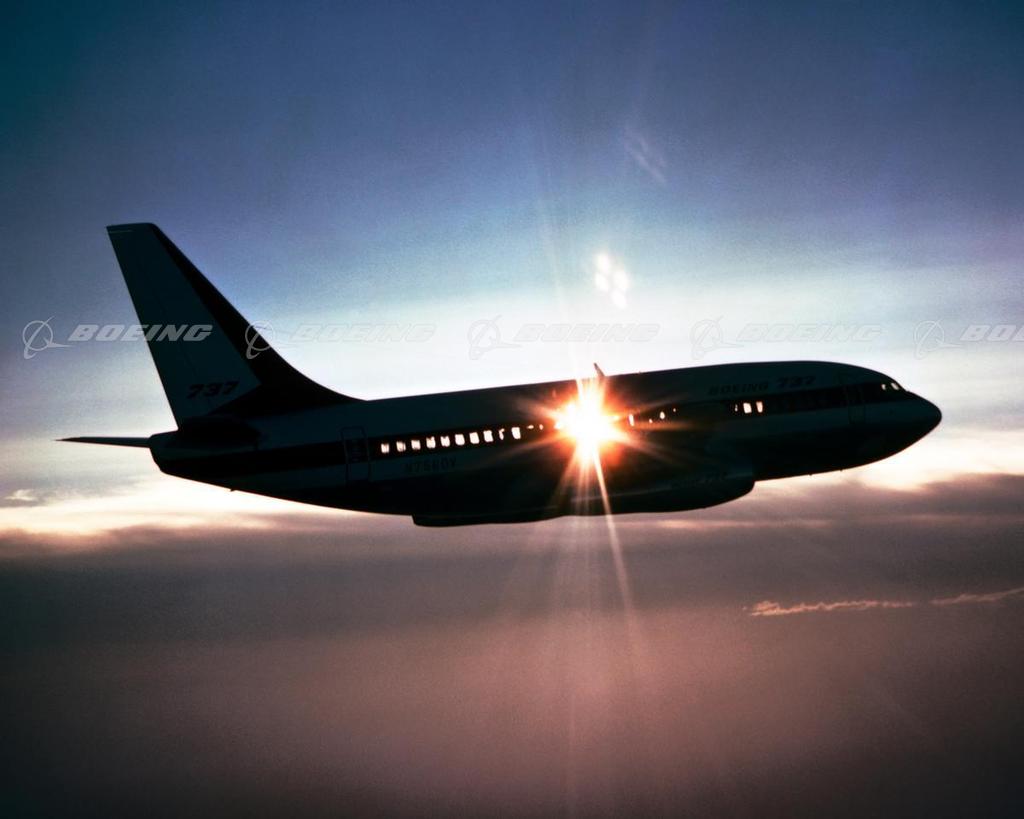 737-200 in Flight, with Setting Sun Visible Through Windows