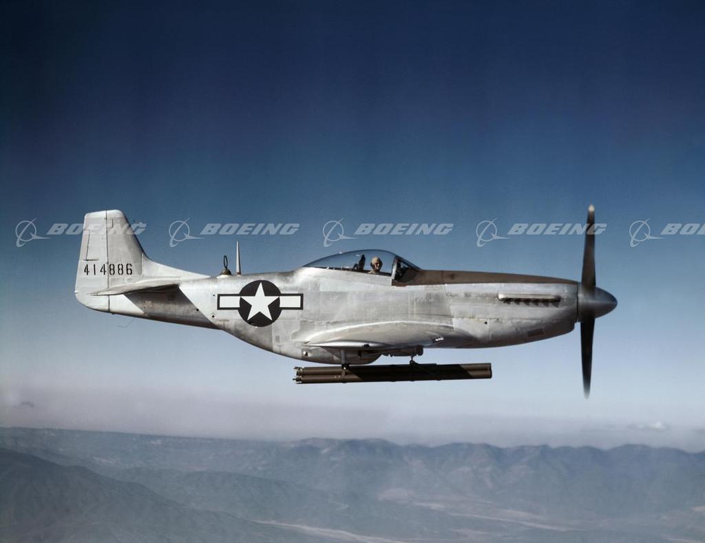 North American Aviation’s powerful and agile P-51 was the first single-engine aircraft based in England to penetrate Nazi Germany during World War II. With its superior aerodynamics, the Mustang outperformed enemy planes and went on to establish an impressive aerial record. Initially designed for the British Royal Air Force for fighter reconnaissance, it first flew in 1941. By war’s end North American built 15,575 P-51 Mustangs. The P-51D Mustang had a wingspan of 37 feet and was 32 feet long. Powered by one 1,490- horsepower engine, it flew 437 mph with a range of 2,300 miles.