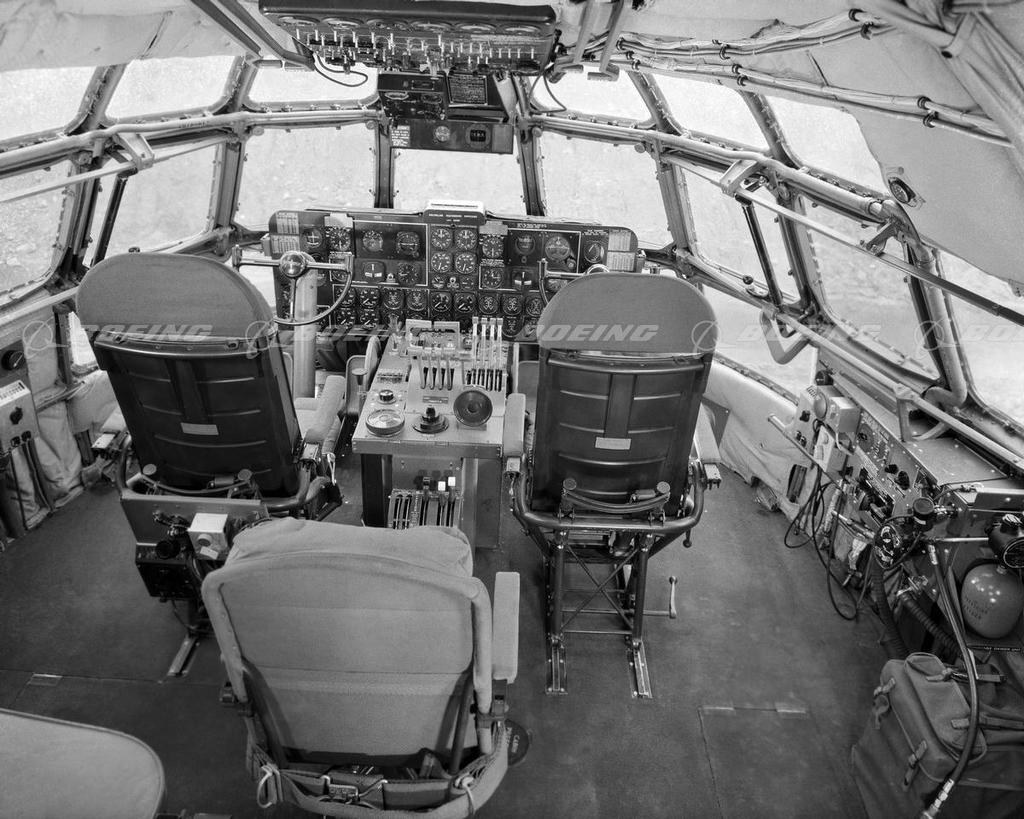 The 377 Stratocruiser was the last of the Boeing propeller-powered luxury airliners. Known as the First Lady of the Airways, it first flew in 1947 as the elegant, civilian offspring of the C-97, a military freighter that carried soldiers and equipment during World War II. A circular stairway led from the cabin to a lower deck luxury lounge. As a sleeper, it held 28 upper- and lower-bunk units. The first Stratocruiser began service in 1949 between San Francisco to Honolulu. Only five years later, the Boeing Dash 80 prototype for the Model 707 made its first flight, and the Stratocruiser became obsolete. It found a new career as special transport for large sections of spacecraft. With its fuselage swollen by a superstructure, the once-elegant Stratocruiser became known as the Pregnant Guppy and, even larger, as the Super Guppy.