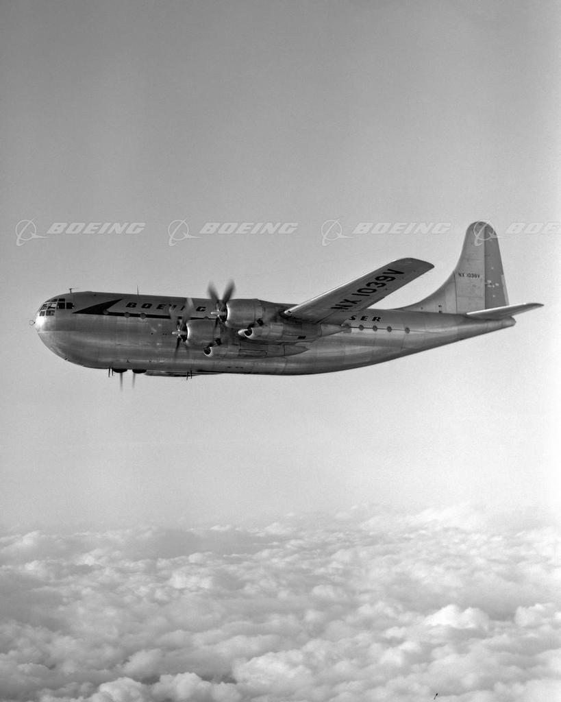 The 377 Stratocruiser was the last of the Boeing propeller-powered luxury airliners. Known as the First Lady of the Airways, it first flew in 1947 as the elegant, civilian offspring of the C-97, a military freighter that carried soldiers and equipment during World War II. A circular stairway led from the cabin to a lower deck luxury lounge. As a sleeper, it held 28 upper- and lower-bunk units. The first Stratocruiser began service in 1949 between San Francisco to Honolulu. Only five years later, the Boeing Dash 80 prototype for the Model 707 made its first flight, and the Stratocruiser became obsolete. It found a new career as special transport for large sections of spacecraft. With its fuselage swollen by a superstructure, the once-elegant Stratocruiser became known as the Pregnant Guppy and, even larger, as the Super Guppy.
