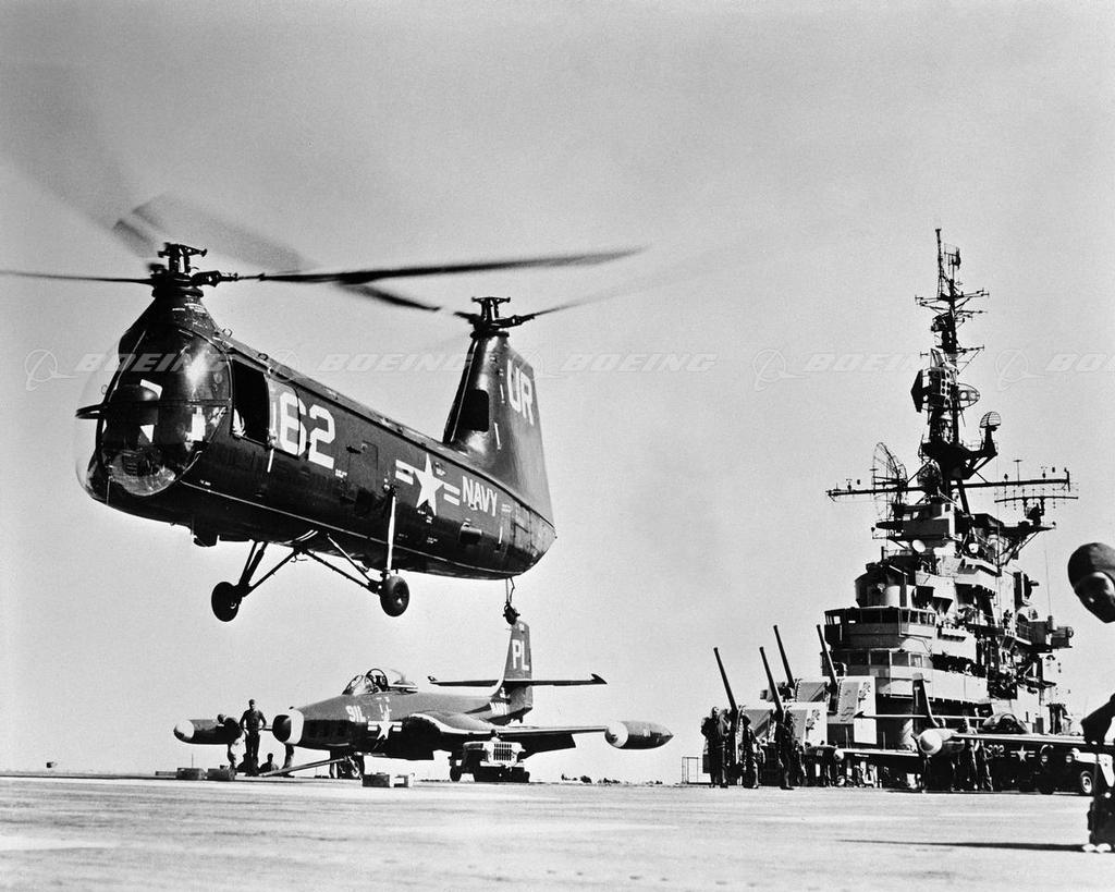The Piaseki HUP-2 Retriever tandem helicopter was developed for the US Navy as a search and rescue vehicle in the 1950s. A McDonnell F2H Banshee waits to catapult behind the HUP-2.