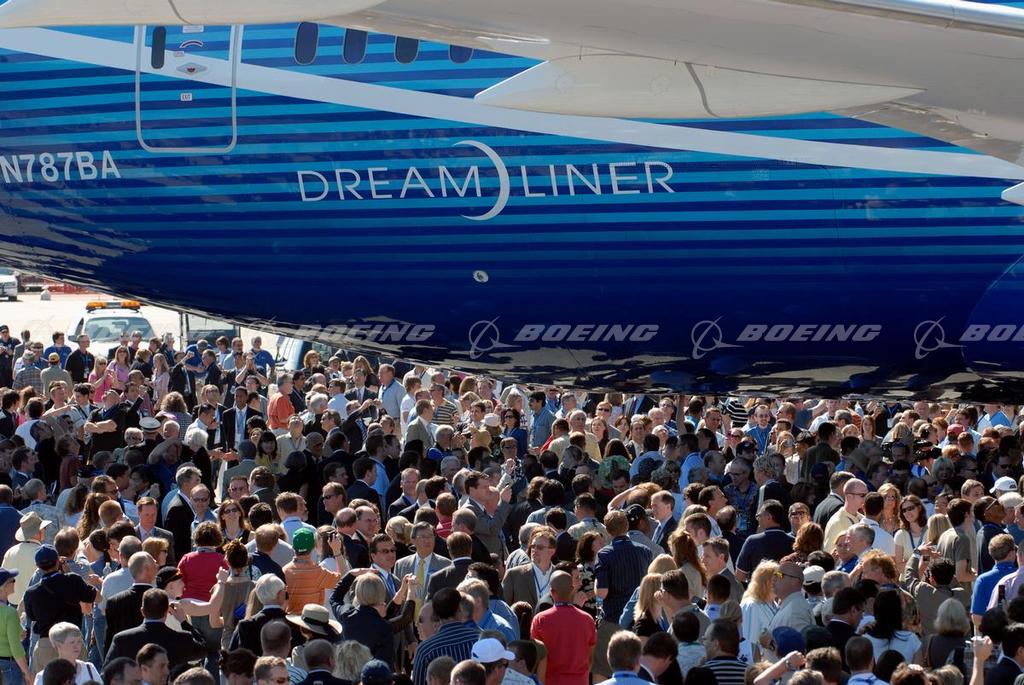Crowds Gather Under the New 787 Dreamliner at its Rollout Event