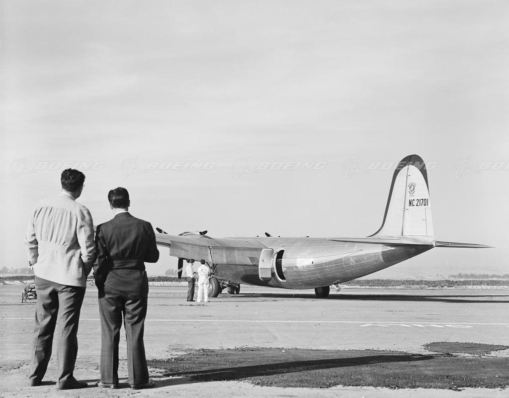 Douglas DC-5 (1939-1941): Development of the DC-5 and the DC-4 began at the same time, but the DC-5 went into production first. The DC-5 was designed as a short-range transport to carry 16 to 22 passengers. Its performance was similar to the DC-3 then being used on longer routes with more passengers. The DC-5 featured a high-wing design and tricycle landing gear. This allowed passengers to step aboard to a level cabin floor just two feet above the ground. The DC-5 was the only Douglas airliner built at the plant in El Segundo, Ca. William E. Boeing bought the first DC-5. He named it “Rover” and used it as an executive aircraft. The next four went to KLM airlines. World War II resulted in the suspension of commercial aircraft deliveries as production was switched to larger and longer-range military transports. The latest seven DC-5s on the line were delivered to the U.S. Nay and Marine Corps under the designation R3D.