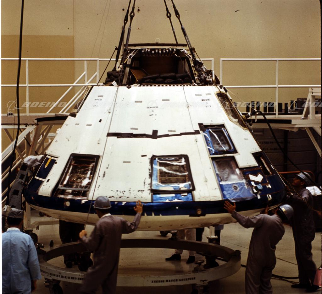 Workers lower the Apollo Command Module onto a piece of support equipment at the North American Aviation facility in Downey, California.