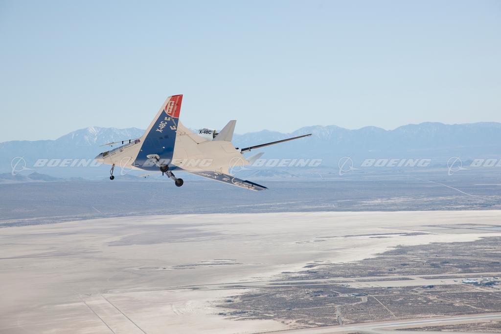 The X-48C, designed by Boeing Research & Technology, built by Cranfield Aerospace Ltd. and flown in partnership with NASA and the U.S. Air Force Research Laboratory, is a scale model of a heavy-lift, subsonic vehicle that forgoes the conventional tube-and-wing airplane design in favor of a triangular tailless aircraft that effectively merges the vehicle’s wing and body. Boeing believes the concept could be developed in the next 15 to 20 years for military applications such as aerial refueling and cargo missions.