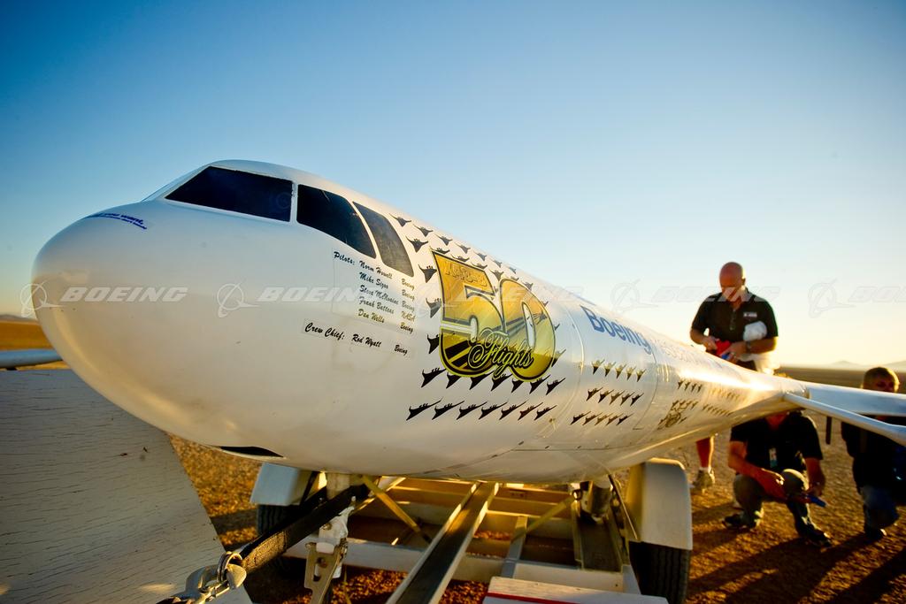 Boeing Research & Technology engineers and technicians in California successfully flew the unmanned, remotely piloted X-48B Blended Wing Body flight-research vehicle for the 50th time April 2, 2009, marking another milestone in the company’s effort to explore and validate the aerodynamic characteristics of the BWB concept. With a 21-foot wingspan, the 500-pound airplane is an 8.5 percent scale model of a heavy-lift, subsonic airplane with a 240-foot wingspan that possibly could be developed in the next 15 or 20 years for military applications such as aerial refueling and cargo hauling.
